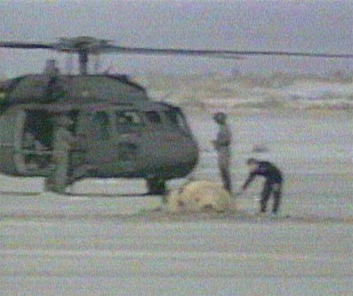 Recovery forces arrive at the impact crater to inspect the capsule just minutes of its unplanned landing. Credit: NASA TV/Spaceflight Now