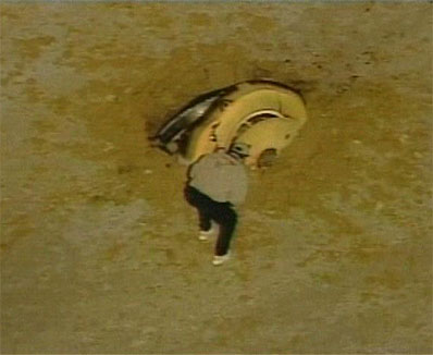 AERIAL VIEWS OF CAPSULE HALF BURIED IN IMPACT CRATER QT