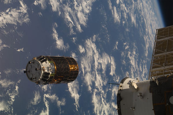The Expedition crew living and working aboard the International Space Station took these dramatic photos of the Japanese cargo freighter arriving at the outpost for capture by the Canadian-built robotic arm.