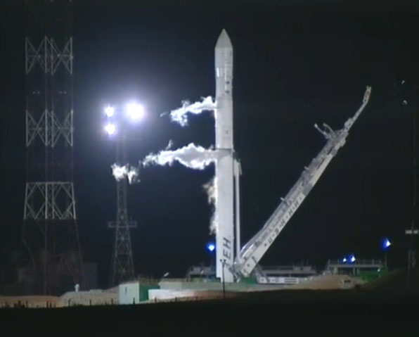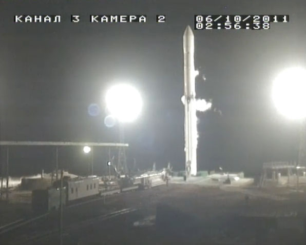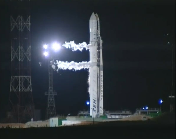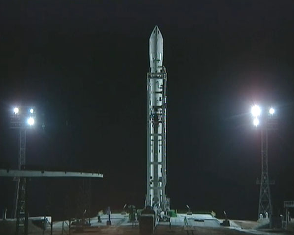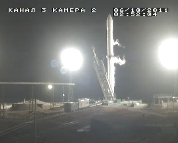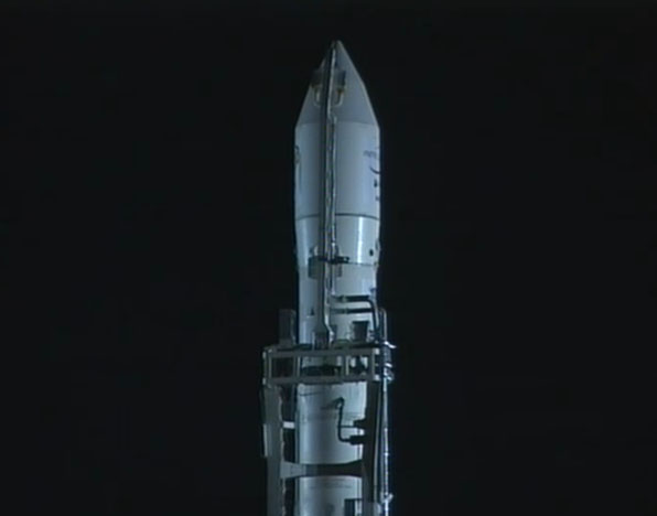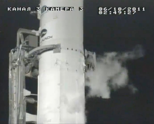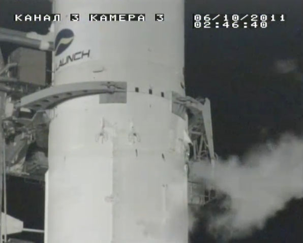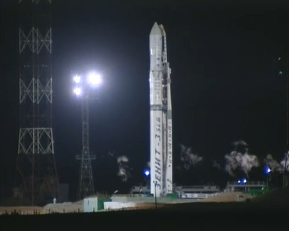 These selected images from the live webcast show the Land Launch Zenit 3SLB rocket being fueled and counting down to blastoff with the Intelsat 18 spacecraft. Also seen here is the transporter/erector arm being retracted and driven away from the launch pad in the final minutes before liftoff. The arm had cradled the booster while traveling by rail from the assembly building to the pad and going vertical for flight.
