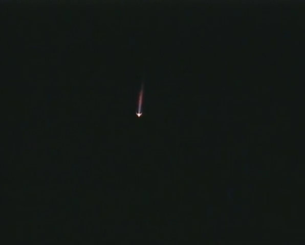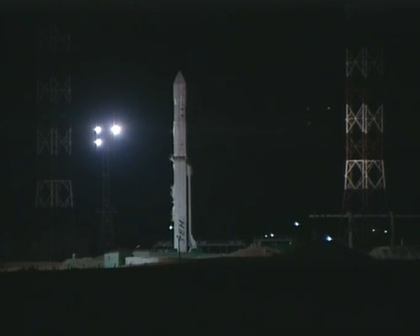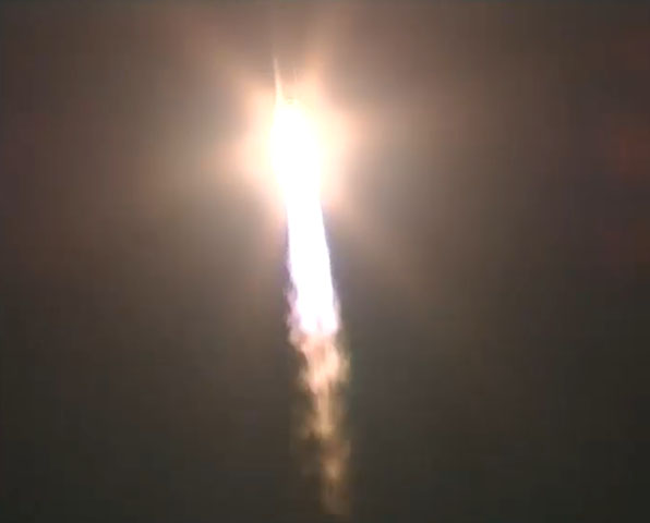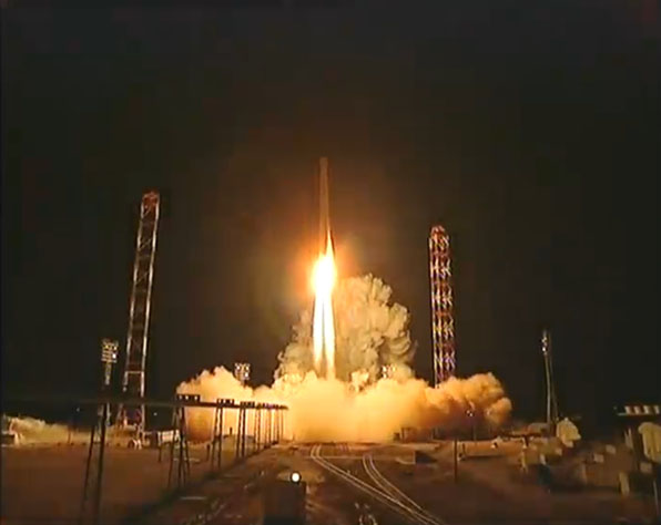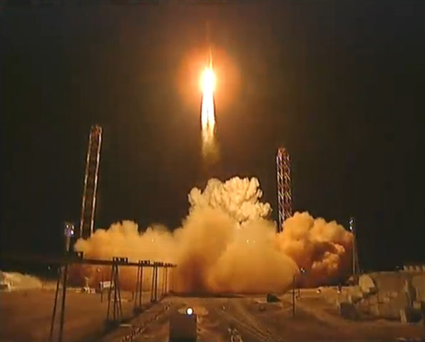 These selected images from the live webcast show the Land Launch Zenit 3SLB rocket soaring into the nighttime sky at the Baikonur Cosmodrome in Kazakhstan carrying the Intelsat 18 commercial telecommunications satellite.