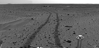 Road trip to Bonneville Crater continues for Spirit BY JUSTIN RAY SPACEFLIGHT NOW Posted: February 17, 2004 Proving to be a real Mars hotrod, the Spirit rover has become the most traveled vehicle on the Red Planet, surpassing the distance accumulated by the Pathfinder rover nearly seven years ago. "We certainly knew that was likely to occur, but it is good to see that it did after about 45 days on the surface," Richard Cook, the newly named Mars Exploration Rover project manager, said Tuesday. Pete Theisinger, project chief for the past few years, has been selected to manage NASA's nuclear-powered Mars Science Laboratory mission scheduled for launch in 2009.