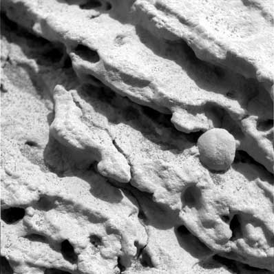 "We believe, at this place on Mars, for some period of time, it was a habitable environment. This was a ground water environment, this was the kind of place that would have been suitable for life. Now that doesn't mean life was there. We don't know that. But this was a habitable place on Mars at one point in time." Ed Weiler, NASA's associate administrator for space science, said the agency's "ultimate quest at Mars is to answer the age-old question: Was there life, is there life on Mars? Today's results are a giant leap toward achieving that long-term goal." Opportunity and its twin, Spirit, were launched to Mars last year to search out signs of water in the geology of two very different landing sites. Spirit landed inside Gusev Crater, which scientists believe once held a vast lake. So far, Spirit has encountered primarily volcanic rocks and soil. But scientists are hopeful lakebed deposits may be found in a nearby crater or elsewhere. Opportunity landed on the other side of the red planet, in an Oklahoma-size region known as Meridiani Planum where hematite, a mineral that forms in the presence of water, had been detected from orbit. But today's announcement did not involve hematite. By pure chance, the rover came to rest in a small crater that featured exposed bedrock. "Ever since Opportunity touched down on Meridiani Planum the night of Jan. 24 and we first opened our eyes and took a look around and saw this marvelous outcrop of layered bedrock literally right in front of us, we've been trying to puzzle out what this outcrop has been trying to tell us," Squyres said. "For the last two weeks, we've been attacking this outcrop literally with everything we have, every single piece of our payload has been brought to bear on this. Over the last couple of weeks, the puzzle pieces have been falling into place and the last puzzle piece fell into place a few days ago. We have concluded the rocks here were once soaked in liquid water." But that is just one part of the puzzle. "One question is were these wonderful layered rocks actually laid down in liquid water? We don't have an answer to that one yet," Squyres said. "We're working on it, we're making some headway, we've got some tantalizing clues in that direction, we may have something for you in another week to two weeks. "But the second question is were these rocks acted upon, were they altered by liquid water? And the answer to that, we believe definitively, is yes." He presented four lines of evidence to support that view. First, he cited the presence of tiny, spherical formations embedded in the rock that have been exposed due to weathering. Detailed examination indicates they most likely are "concretions," small, rounded bodies that form when minerals precipitate from water and build up around a nucleus in sedimentary rock of different composition.