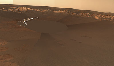 "One possibility is that we had an eruption of volcanic ash," he said. "Ash settles out, maybe there were a number of eruptions and you build up layers of a finely layered, fine-grained rock fundamentally basaltic in character, but you've got lots and lots of pore space in it. And then subsequent to that, water percolates through that rock and it deposits sulfates, it changes the chemistry. So it's fundamentally a process of alteration of this ash as water percolates through it." In the second scenario, "you had a salty sea at this location and you had water in that sea, you might have had currents, you might have even had waves, I don't know. We see things that might be the result of water sloshing around, so we'll go and take a look at that. "Then, as the water evaporates away, crystals of salt, sulfate salts are deposited from that, they settle out, more salts are deposited, the water evaporates away, maybe that happens multiple times and you build up layers and layers of these salts which then subsequently can have water percolate through them and cause recrystallization and so forth. "Two very different scenarios," Squyres said. "Both of those are fundamentally possible based on what we see right now." But make no mistake, he added. "There's nothing like this going on on Mars today. This is a window into the past of Mars, it's totally different from anything we see happening at the surface today."