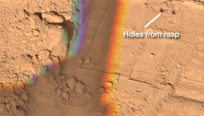 The motorized rasp -- located on the back of the lander's robotic arm scoop -- made two distinct holes in a trench informally named "Snow White." The material loosened by the rasp was collected in the scoop and documented by the Robotic Arm Camera. The activity was a test of the rasping method of gathering an icy sample, in preparation for using that method in coming days to collect a sample for analysis in an oven of Phoenix's Thermal and Evolved-Gas Analyzer. "This was a trial that went really well," said Richard Morris, a Phoenix science team member from NASA's Johnson Space Center, Houston. "While the putative ice sublimed out of the shavings over several hours, this shows us there will be a good chance ice will remain in a sample for delivery" to Phoenix's laboratory ovens. Phoenix on Wednesday will be commanded to continue scraping and enlarging the "Snow White" trench and to conduct another series of rasp tests. The lander's cameras will again be used to monitor the sample in the scoop after its collection. The Phoenix mission is led by Peter Smith of the University of Arizona with project management at JPL and development partnership at Lockheed Martin, Denver. International contributions come from the Canadian Space Agency; the University of Neuchatel; the universities of Copenhagen and Aarhus, Denmark; Max Planck Institute, Germany; and the Finnish Meteorological Institute. |