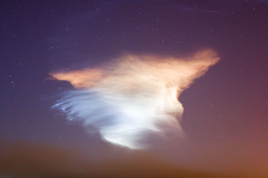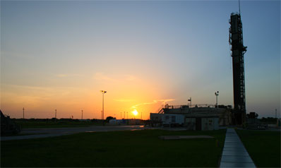 The remnant exhaust cloud from the launch is illuminated at sunrise. Larger version here Credit: Chris Miller/Spaceflight Now