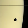 Tethys floats before the massive, golden-hued globe of Saturn in this natural color view from Cassini. The thin, dark line of the rings curves around the horizon at top. The edge of the planet appears fuzzy, which may indicate that we are seeing haze layers that are separated from the main cloud deck.
