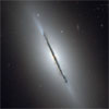 Hubble Space Telescope gives this unique view of the disk galaxy NGC 5866 tilted nearly edge-on to our line-of-sight. Hubble's sharp vision reveals a crisp dust lane dividing the galaxy into two halves. The image highlights the galaxy's structure: a subtle, reddish bulge surrounding a bright nucleus, a blue disk of stars running parallel to the dust lane, and a transparent outer halo.