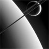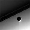 The "eyes" of Cassini -- its powerful imaging cameras -- bear witness to the majestic and spectacular sights of the Saturn system, as this views attests. Here, the probe gazes upon Titan in the distance beyond Saturn and its dark and graceful rings.