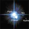 The names Nix and Hydra have been approved for the two small satellites of Pluto discovered in May 2005. In mythology, Nix is the goddess of darkness and night, befitting a satellite orbiting distant Pluto, the god of the underworld. Hydra is the terrifying monster with the body of a serpent and nine heads, befitting the outermost moon of Pluto, the ninth planet in the solar system.