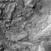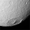 Cassini looks into the 150-mile wide crater Melanthius in this view of the southern terrain on Saturn's moon Tethys. The crater possesses a prominent cluster of peaks in its center which are relics of its formation. Notable here is a distinct boundary in crater abundance -- the cratering density is much higher in the farthest western terrain than elsewhere.