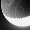 Cassini recently whizzed past Dione, capturing this slightly motion-blurred view of the moon's fractured and broken landscape in reflected light from Saturn. The many canyons on Dione rip through more ancient craters. Some medium-sized craters, like the one right of center, have several others overprinted onto them.