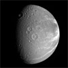 Bright fractures creep across the surface of icy Dione, one of Saturn's moons. This extensive canyon system is centered on a region of terrain that is significantly darker that the rest of the moon. Part of the darker terrain is visible at right.