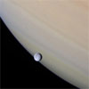 A serene orb of ice is set against the gentle pastel clouds of giant Saturn in this Cassini spacecraft image. Rhea transits the face of the gas giant, whose darkened rings and their planet-hugging shadows appear near upper right.