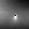Blazing like an icy torch, the plume of Enceladus shines in scattered sunlight as the moon casts a shadow onto Saturn's E ring. Some of the tiny ice particles erupted from the moon's south polar region go into Saturn orbit, forming the doughnut-shaped ring, onto which the moon's shadow is cast in this view from Cassini.