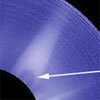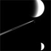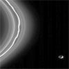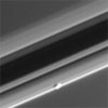 The shepherd moon, Pandora, is seen here alongside the narrow F ring that it helps maintain. Pandora is 52 miles across. The appearance of Pandora here is exciting, as the moon's complete shape can be seen, thanks to reflected light from Saturn, which illuminates Pandora's dark side. The hint of a crater is visible on the dark side of the moon.