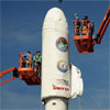 NASA moved one step closer to a long-awaited test flight of America's new moon rocket Wednesday night, when engineers hoisted the first piece of the booster atop an Apollo-era launch platform.