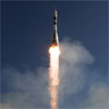 A Russian Soyuz rocket blasted off from Yuri Gagarin's launch pad in Kazakhstan Wednesday, carrying two fresh crew members and the founder of Cirque du Soleil on a voyage to the International Space Station.