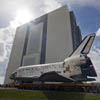 Moving a major step closer to its final spaceflight before retirement, shuttle Discovery took a road trip Thursday morning from the hangar to the nearby Vehicle Assembly Building at Kennedy Space Center for attachment to the external fuel tank and twin solid rockets. Engineers ran into trouble Friday morning with one of the main bolts that connect the orbiter to the tank, but the problem was fixed Saturday.