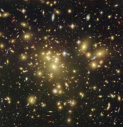 Hubble peered straight through the center of one of the most massive known galaxy clusters, called Abell 1689. This required Hubble to gaze at the distant cluster, located more than 2.2 billion light-years away, for more than 13 hours. The gravity of the cluster's trillion stars, plus dark matter, acts as a 2-million-light-year-wide "lens" in space. This "gravitational lens" bends and magnifies the light of the galaxies located far behind it. The Advanced Camera's IMAX movie-quality sharpness, combined with the behemoth lens, reveals remote galaxies previously beyond even Hubble's reach. A few may be twice as faint as those photographed in the Hubble Deep Field, which previously pushed the telescope to its sensitivity limits. Though much more analysis is needed, Hubble astronomers speculate that some of the faintest objects in the picture are probably over 13 billion light-years away. In the image, hundreds of galaxies, many billions of light- years away, are smeared by the gravitational bending of light into a spider-web tracing of blue and red arcs of light. Though gravitational lensing has been studied previously, with Hubble and ground-based telescopes, this phenomenon has never been seen in such detail. The Advanced Camera picture reveals 10 times more arcs than would be seen by a ground-based telescope. The ACS is five times more sensitive, and provides pictures that are twice as sharp, as the previous workhorse Hubble cameras. It can see the very faintest arcs with greater clarity. The picture presents an immense jigsaw puzzle for Hubble astronomers to spend months untangling. Interspersed with the foreground cluster are thousands of galaxies, which are lensed images of the galaxies in the background universe. Detailed analysis of the images promises to shed light on the mystery of dark matter. Dark matter is an invisible form of matter. It is the source of most of the gravity in the universe, because it is much more abundant than the "normal matter" that makes up planets, stars and galaxies. The lensing allows astronomers to map the distribution of dark matter in galaxy clusters. This should offer new clues to the nature of dark matter. By studying the lensed distant galaxies, astronomers expect to better trace the history of star formation in the universe over the past 13 billion years. The picture is an exquisite demonstration of Albert Einstein's prediction that gravity warps space and therefore distorts a beam of light, like a rippled shower curtain. When the laws of relativity were formulated in the early 20th century, scientists did not know that stars were organized into galaxies beyond our own Milky Way. Great clusters of galaxies are massive enough to warp space and deflect light in a way that is detectable from Earth. The Abell cluster is the ideal target because it is so massive. The more massive a cluster is, the larger the effects of gravitational lensing. The Space Telescope Science Institute is operated by the