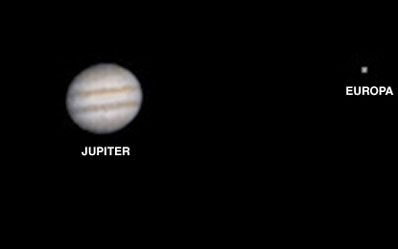 The image also shows the Earth-facing hemisphere of the Moon, since the Moon was on the far side of Earth as viewed from Mars. The slightly lighter tone of the lower portion of the image of the Moon results from the large and conspicuous ray system associated with the crater Tycho. The image also shows Jupiter and three of the four Galilean satellites: Callisto, Ganymede, and Europa. At the time, Jupiter's giant red spot had rotated out of view, and, the other so-called Galilean satellite, Io, was behind Jupiter as seen from Mars. This image has been specially processed to show both Jupiter and its satellites, since Jupiter was much brighter than the three satellites.