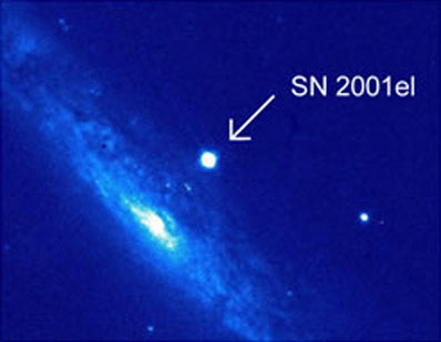 First shape measurement of an exploding white dwarf LAWRENCE BERKELEY NATIONAL LABORATORY NEWS RELEASE Posted: August 6, 2003 Scientists at Lawrence Berkeley National Laboratory, working with colleagues at the European Southern Observatory (ESO) and the University of Texas at Austin, have established that the extraordinarily bright and remarkably similar astronomical "standard candles" known as Type Ia supernovae do not explode in a perfectly spherical manner. Led by Lifan Wang, an astronomer and astrophysicist in Berkeley Lab's Physics Division, the researchers used the ESO's Very Large Telescope (VLT) in Chile to measure the polarization of light emitted by supernova 2001el as it brightened and dimmed. This is the first time the intrinsic polarization of a normal Type Ia supernova has been detected.