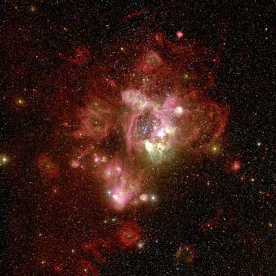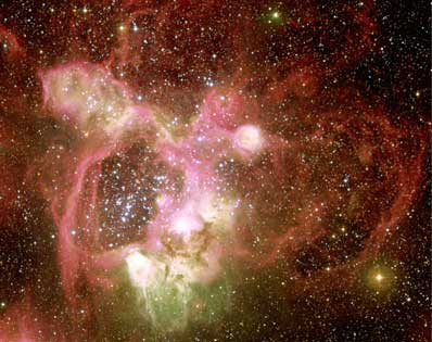 N44 in the Large Magellanic Cloud is a spectacular example of such a giant H II region. Having observed it in 1999, a team of European astronomers again used the Wide-Field-Imager (WFI) at the MPG/ESO 2.2-m telescope of the La Silla Observatory, pointing this 67-million pixel digital camera to the same sky region in order to provide another striking - and scientifically extremely rich - image of this complex of nebulae. With a size of roughly 1,000 light-years, the peculiar shape of N44 clearly outlines a ring that includes a bright stellar association of about 40 very luminous and bluish stars.