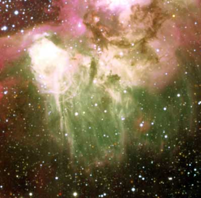 However, some regions stand out because of their distinctly greener shade and their high brightness. Each of these regions contains at least one extremely hot star with a temperature somewhere between 30,000 and 70,000 degrees. Its intense ultraviolet radiation heats the surrounding gas to a higher temperature, whereby more oxygen atoms are doubly ionised and the emission of green light is correspondingly stronger.