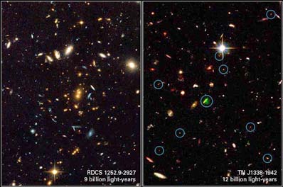 These findings further support observations and theories that galaxies formed relatively early in the history of the cosmos. The existence of such massive clusters in the early universe agrees with a cosmological model wherein clusters form from the merger of many sub-clusters in a universe dominated by cold dark matter. The precise nature of cold dark matter, however, is still not known. The first Hubble study estimated that galaxies in RDCS 1252 formed the bulk of their stars more than 11 billion years ago (at redshifts greater than 3). The results were published in the Oct. 20, 2003 issue of the Astrophysical Journal. The paper's lead author is John Blakeslee of the Johns Hopkins University in Baltimore, Md. The second Hubble study uncovered, for the first time, a proto-cluster of "infant galaxies" that existed more than 12 billion years ago (at redshift 4.1). These galaxies are so young that astronomers can still see a flurry of stars forming within them. The galaxies are grouped around one large galaxy. These results will be published in the Jan. 1, 2004 issue of Nature. The paper's lead author is George Miley of Leiden Observatory in the Netherlands. "Until recently people didn't think that clusters existed when the universe was only about 5 billion years old," Blakeslee explained. "Even if there were such clusters," Miley added, "until recently astronomers thought it was almost impossible to find clusters that existed 8 billion years ago. In fact, no one really knew when clustering began. Now we can witness it." Both studies led the astronomers to conclude that these systems are the progenitors of the galaxy clusters seen today. "The cluster RDCS 1252 looks like a present-day cluster," said Marc Postman of the Space Telescope Science Institute in Baltimore, Md., and co-author of both research papers. "In fact, if you were to put it next to a present-day cluster, you wouldn't know which is which." A tale of two clusters This idea is strengthened by X-ray observations of the massive cluster RDCS 1252. Chandra and the European Space Agency's XMM-Newton provided astronomers with the most accurate measurements to date of the properties of an enormous cloud of hot gas that pervades the massive cluster. This 160-million-degree Fahrenheit (70-million-degree Celsius) gas is a reservoir of most of the heavy elements in the cluster and an accurate tracer of its total mass. A paper by Piero Rosati of the European Southern Observatory (ESO) and colleagues that presents the X-ray observations of RDCS 1252 will be published in January 2004 in the Astronomical Journal. "Chandra's sharp vision resolved the shape of the hot gas halo and showed that RDCS 1252 is very mature for its age," said Rosati, who discovered the cluster with the ROSAT X-ray telescope. RDCS 1252 may contain many thousands of galaxies. Most of these galaxies, however, are too faint to detect. But the powerful "eyes" of the ACS pinpointed several hundred of them. Observations using ESO's Very Large Telescope (VLT) provided a precise measurement of the distance to the cluster. The ACS enabled the researchers to accurately determine the shapes and colors of the 100 galaxies, providing information on the ages of the stars residing in them. The ACS team estimated that most of the stars in the cluster were already formed when the universe was about 2 billion years old. X-ray observations, furthermore, showed that 5 billion years after the big bang the surrounding hot gas had been enriched with heavy elements from these stars and had been swept away from the galaxies. If most of the galaxies in RDCS 1252 have reached maturity and are settling into a quiet adulthood, the forming galaxies in the distant proto-cluster are in their energetic, unruly youth. The proto-cluster TN J1338 contains a massive embryonic galaxy surrounded by smaller developing galaxies, which look like dots in the Hubble image. The dominant galaxy is producing spectacular radio-emitting jets, fueled by a supermassive black hole deep within the galaxy's nucleus. Interaction between these jets and the gas can stimulate a torrent of star birth. The energetic radio galaxy's discovery by radio telescopes prompted astronomers to hunt for the smaller galaxies that make up the bulk of the cluster. "Massive clusters are the cities of the universe, and the radio galaxies within them are the smokestacks we can use for finding them when they are just beginning to form," Miley said. The two findings underscore the power of combining observations from many different telescopes that provided views of the distant universe in a range of wavelengths. Hubble's advanced camera provided critical information on the structure of both distant galaxy clusters. Chandra's and XMM-Newton's X-ray vision furnished the essential measurements of the primordial gas in which the galaxies in RDCS 1252 are embedded, and accurate estimates of the total mass contained within that cluster. Large ground-based telescopes, like the VLT, provided precise measurements of the distance of both clusters as well as the chemical composition of the galaxies in them. The ACS team is conducting further observations of distant clusters to solidify our understanding of how these young clusters and their galaxies evolve into the shape of things seen today. Their planned observations include using near-infrared observations to analyze the star-formation rates in some of the target clusters, including RDCS 1252, to measure the cosmic history of star formation in these massive structures. The team is also searching the regions around several ultra-distant radio galaxies for additional examples of proto-clusters. The team's ultimate scientific goal is to establish a complete picture of cluster evolution beginning with the formation at the earliest epochs and detailing the evolution up to today. The Space Telescope Science Institute (STScI) is operated by the