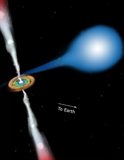 The observation is of a familiar source named SS 433 -- a binary star system within our Galaxy in the constellation Aquila, the Eagle, about 16,000 light years away. The black hole and its companion are about two-thirds closer to each other than the planet Mercury is to the Sun. The jets shoot off at 175 million miles per hour, 26 percent of light speed. "The high-speed jets in nearby SS 433 may be caused by the same mechanisms as the powerful outflows in the most distant and much more massive black holes, such as quasars," said Laura Lopez, an undergraduate student at MIT and lead author on a paper about the result. "SS 433 provides a nice local laboratory to study the formation of and conditions in relativistic jets." Dr. Herman Marshall, Ms. Lopez's research supervisor, led the investigation. Matter from the companion star pours into the black hole via a swirling accretion disk, much like water down a drain. Black hole particles jets are thought to be produced as some of the matter encounters strong magnetic fields close to the black hole. SS 433 is angled in such a way that one jet is shooting away from us while the other is aimed slightly towards us. The black hole's companion star enters the picture here as it periodically eclipses parts of the jets. Scientists use the eclipse, called an occultation, as a tool to block one part of the jet so that they can study other parts more easily. Using the Chandra High Energy Transmission Grating Spectrometer, the MIT group measured many characteristics of the jets, forming the best view of a jet's structure ever obtained. No image was created, as in other Chandra observations. Rather, the scientists pieced together the scene through spectroscopy, the fingerprint of chemical elements that reveals temperature and velocity of matter in the jets. They determined the length of the X-ray-emitting portion of the jet (over one million miles, about five times the distance from the Earth to the Moon); the temperature range (dropping from about 100 million degrees Celsius to 10 million degrees farther out); the chemical abundances (iron, silicon, and more); and the jet opening angle. In a previous observation they measured the jet's density. With this information, the team could determine that the jet base was five times closer to the black hole than previously observed, with a base diameter of about 1,280 miles. Also, from a bit of geometry along with information on the size of the binary system from optical observations by a team led by Douglas Gies of Georgia State University, the MIT group determined that the size of the companion star that blocked the view of the receding jet is about nine times the size of the Sun. From that, they estimated that the black hole is 16 solar masses. (For many years scientists have speculated whether SS 433 contains a black hole or a neutron star. This announcement of a 16-solar-mass object confirms that it is indeed a black hole, too massive to be a neutron star.) "The uniqueness of SS 433 cannot be overstated," said Marshall. "SS 433 provides an excellent opportunity to study the origin, evolution, and long-term behavior of jets because the X rays come from a region very close to the black hole. Of the hundreds of jets observed in the radio and X-ray bands, this is the only one for which we have a solid statement that it contains atomic nuclei and for which we are sure of the internal temperature and density." Supermassive black holes with jets, such as quasars, might display similar behavior, but they are so massive and so distant that changes cannot be observed because time scales are too long. Thus SS 433 serves as a laboratory to study the jet phenomenon "close to home," Marshall said. As such, further Chandra observations are planned. Chandra data were taken with the HETGS in conjunction with Chandra's Advanced