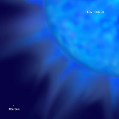 "We think we've found what may be the most massive and most luminous star ever discovered," said Steve Eikenberry, a UF professor of astronomy and the lead author of a paper on the discovery that was recently submitted to the Astrophysical Journal. Eikenberry will discuss his findings in a news conference to be held by the society at 12:30 p.m. today at the Courtland Room in the Hyatt Regency Atlanta, where the conference is being held. One longstanding problem with gauging the brightness of stars at great distances is that what seems at first to be one amazingly bright star turns out on closer examination to be a cluster of nearby stars. Don Figer, an astronomer at the Baltimore-based Space Telescope Science Institute who led the team that discovered the Pistol Star in 1997, said the high-quality data collected by the UF-led team reduced but did not eliminate this possibility. "The high-resolution data prove that the object is not simply a cluster of lower mass stars, although it is possible that it is a collection of a few stars in a tight orbit around each other," Figer said. "More study will be needed to determine the distance and singularity of the object in order to establish whether the object is truly the most massive star known." Astronomers have known about LBV 1806-20 since the 1990s. At that time, it was identified as a "luminous blue variable star" - a relatively rare, massive and short-lived star. Such stars get their names from their propensity to display light and color variability in the infrared spectrum. Luminous blue variable stars are extremely large, with LBV 1806-20 probably at least 150 times larger than the sun, Eikenberry said. The stars are also extremely young by stellar time. LBV 1806-20 is estimated at less than 2 million years old. The sun in our solar system, by contrast, is 5 billion years old. Typical stars, such as the sun, live 10 billion years. LBVs have "short and troubled lives," as Eikenberry put it, because "the more mass you have, the more nuclear fuel you have, the faster you burn it up. They start blowing themselves to bits." Eikenberry's team made several key advances that led to the estimate of the star's oversized mass and brightness, he said. One, they sharpened infrared images obtained from the Palomar 200-inch telescope at the California Institute of Technology's Palomar Observatory using a camera equipped with "speckle imaging," a relatively new technology for improving resolution of objects at great distances. "The shimmering that you see coming off a hot blacktop road in the summer - the upper atmosphere kind of does that with star light," Eikenberry said. "Speckle imaging kind of freezes that motion out, and you get much better images." Composed of 17 astronomers and graduate students, the team also came up with an accurate estimate for the distance from the Earth to the bright star. Team members further determined its temperature and how much of the star's infrared light gets absorbed by dust particles as the light makes its way toward Earth. The scientists relied on data collected by the Blanco 4-meter telescope at the National Optical Astronomy Observatory's Cerro Tololo Inter-American Observatory in Chile. Each of these variables contributed to the estimate of the star's remarkable candlepower. "You correct for dust absorption, then you correct for temperature of the star, you correct for distance of the star - all of those things feed into luminosity," Eikenberry said. One of the mysteries about LBV 1806-20 is how it got so big. Current theories of star formation suggest they should be limited to about 120 solar masses, or 120 times as large as the sun, because the heat and pressure from such big stars' cores force matter away from their surfaces. Eikenberry said one possibility is that the big star was formed in a process called shock-induced star formation, which occurs when a supernova blows up and slams the gaseous material in a molecular cloud together into a massive star. The star's size is not its only distinguishing characteristic. It is located in a small cluster of highly unusual or extremely rare stars, including a so-called "soft gamma ray repeater," a freakishly magnetic neutron star that is one of only four identified in the entire galaxy of 100 billion stars. With a magnetic field hundreds of trillions of times more powerful than Earth's magnetic field, this type of star gets its name from its periodic bursts of gamma rays. The cluster also apparently includes an infant or newly formed star. "We've got this zoo of freak stars, all crammed together, really nearby, and they're all part of the same cluster of stars," Eikenberry said. "It's really kind of weird." Also buried within the cluster is an extremely young infant star, Eikenberry said. The presence of the infant star, the luminous blue variable and the soft gamma ray repeater are vivid examples of an important emerging fact about stellar evolution: All stars in a single cluster don't form at the same time, he said. "We're seeing what I think is going to become a textbook example of the fact that stars aren't all born in an instant, even in a small cluster," he said. Figer, the Pistol Star discoverer, said the research makes an important contribution to astronomers' understanding of the star formation process. "The findings are significant because such massive stars are very rare and define the upper limits of the star formation process," he said. "The team has made a remarkable contribution to our understanding of the most extreme stars." The team carrying out this work also included UF's Jessica LaVine; Keith Matthews, with the California Institute of Technology; Stephane Corbel, with the Universite de Paris; John-David Smith, with the University of Arizona; John Wilson, with the University of Virginia; Donald Barry, Michael Colonno and James Houck, all with Cornell University; and undergraduate research students Shannon Patel, Malia Jackson, and Dounan Hu of