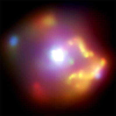 Whirling around 20 times a second, the pulsar is generating power at a rate equivalent to 30,000 Suns. This pulsar is remarkably similar to the famous Crab Nebula pulsar, although they are seen at vastly different distances, 160,000 light years versus 6,000 light years. Both SNR 0540-69.3 and the Crab pulsar are rotating rapidly, and are about a thousand years old. Both pulsars are pumping out enormous amounts of X-radiation and high-energy particles, and both are immersed in magnetized clouds of high-energy particles that are a few light years in diameter. Both clouds are luminous X-ray sources, and in both cases the high-energy clouds are surrounded by a filamentary web of cool gas that shows up at optical wavelengths. However, the extensive outer shell of 50 million degree Celsius gas in SNR 0540-69.3 has no counterpart in the Crab Nebula. This difference is thought to be due to environmental factors. The massive star that exploded to create SNR 0540-69.3 was evidently in a region where there was an appreciable amount of gas. The supernova shock wave swept up and heated the surrounding gas and created the extensive hot X-ray shell. A similar shock wave presumably exists around the Crab Nebula, but the amount of available gas is apparently too small to produce a detectable amount of X-radiation. |