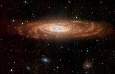 Such an outside perspective will teach astronomers how our own galaxy, as well as others like it, might have formed and evolved. The latest observations are the first in a large-scale effort to observe 75 nearby galaxies with Spitzer's highly sensitive infrared eyes. Called Spitzer Infrared Nearby Galaxies Survey, the program will combine Spitzer data with that from other ground- and space-based telescopes operating at wavelengths ranging from ultraviolet to radio to create a comprehensive map of the selected galaxies. The program's first target, NGC 7331, was chosen in part for its striking similarities to the Milky Way. While these so-called twin galaxies do not share the same parents, they have many features in common, including number of stars, mass, spiral arm pattern and star-formation rate of a few stars per year. Whether the Milky Way has an inner star-forming ring like that of NGC 7331 is not known. NGC 7331 is located about 50 million light-years away in the constellation Pegasus. The new Spitzer image demonstrates the power of the telescope's infrared eyes to dissect galaxies into their various parts. Taken by the telescope's infrared array camera, the false-colored picture readily distinguishes NGC 7331's arms (brownish red), central bulge (blue) and star-forming ring (yellow). The composition of materials making up these regions was also revealed by the Spitzer observations: the central bulge consists primarily of older stars; the ring possesses a large amount of gas and dusty organic molecules called polycyclic aromatic hydrocarbons, which typically glow when illuminated by newborn stars; and the arms contain these same dust grains to a lesser degree. Polycyclic aromatic hydrocarbons are also found on Earth, on burnt toast and in car exhaust among other places. Data from Spitzer's infrared spectrograph instrument were also used to show that the center of NGC 7331 harbors either an unusually high concentration of massive stars, or a moderately active black hole about the same size as the one lurking at the core of our galaxy. These findings will appear in two papers in the September issue of a special supplement to the Astrophysical Journal. Dr. Michael W. Regan of the Space Telescope Institute, Baltimore, Md., is lead author of a paper detailing observations from the infrared array camera, and Smith is lead author of a paper on the infrared spectrograph results. The Spitzer Infrared Nearby Galaxies Survey project is conducted by a team of about 25 scientists from 12 institutions, and is led by principal investigator Dr. Robert C. Kennicutt of the University of Arizona, Tucson. Launched August 25, 2003, the Spitzer Space Telescope is the fourth of NASA's Great Observatories, a program that also includes the Hubble Space Telescope, Chandra X-ray Observatory and Compton Gamma Ray Observatory. JPL manages the Spitzer Space Telescope mission for NASA's Office of Space Science, Washington, D.C. Science operations are conducted at the Spitzer Science Center at the California Institute of Technology in Pasadena. JPL is a division of Caltech. Spitzer's infrared spectrograph was built by Cornell University, Ithaca, N.Y., and Ball Aerospace Corporation, Boulder, Colo. The instrument's development was led by Dr. Jim Houck of Cornell. Spitzer's infrared array camera was built by NASA Goddard Space Flight Center, Greenbelt, Md. The camera's development was led by Dr. Giovanni Fazio of Smithsonian Astrophysical Observatory, Cambridge, Mass. |