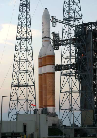 The mobile service tower is rolled back to expose Boeing's Delta 4-Heavy rocket at sunrise for the Wet Dress Rehearsal launch day simulation on October 26 at Cape Canaveral Air Force Station's pad 37B. Credit: Boeing photo by Carleton Bailie