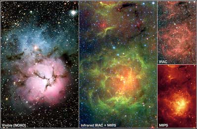 "Massive stars develop in very dark regions so quickly that is hard to catch them forming," said Dr. Jeonghee Rho of the Spitzer Science Center, California Institute of Technology, Pasadena, Calif., principal investigator of the recent observations. "With Spitzer, it's like having an ultrasound for stars. We can see into dust cocoons and visualize how many embryos are in each of them." The Trifid Nebula is a giant star-forming cloud of gas and dust located 5,400 light-years away in the constellation Sagittarius. Previous images taken by the Institute for Radioastronomy millimeter telescope in Spain show that the nebula contains four cold knots, or cores, of dust. Such cores are "incubators" where stars are born. Astronomers thought the ones in the Trifid Nebula were not yet ripe for stars. But, when Spitzer set its infrared eyes on all four cores, it found that they had already begun to develop warm stellar embryos. "Spitzer can see the material from the dark cores falling onto the surfaces of the embryonic stars, because the material gets hotter as gravity draws it in," said Dr. William T. Reach of the Spitzer Science Center, co-author of this new research. "By measuring the infrared brightness, we can not only see the individual embryos but determine their growth rate." The Trifid Nebula is unique in that it is dominated by one massive central star, 300,000 years old. Radiation and winds emanating from the star have sculpted the Trifid cloud into its current cavernous shape. These winds have also acted like shock waves to compress gas and dust into dark cores, whose gravity caused more material to fall inward until embryonic stars were formed. In time, the growing embryos will accumulate enough mass to ignite and explode out of their cores like baby birds busting out of their eggs. Because the Trifid Nebula is home to just one massive star, it provides astronomers a rare chance to study an isolated family unit. All of the newfound stellar embryos are descended from the nebula's main star. Said Rho, "Looking at the image, you know exactly where the embryos came from. We use their colors to determine how old they are. It's like studying the family tree for a generation of stars." Spitzer discovered 30 embryonic stars in the Trifid Nebula's four cores and dark clouds. Multiple embryos were found inside two massive cores, while a sole embryo was seen in each of the other two. This is one of the first times that clusters of embryos have been observed in single cores at this early stage of stellar development. "In the cores with multiple embryos, we are seeing that the most massive and brightest of the bunch is near the center. This implies that the developing stars are competing for materials, and that the embryo with the most material will grow to be the largest star," said Dr. Bertrand Lefloch of Observatoire de Grenoble, France, co-author of the new research. Spitzer also uncovered about 120 small baby stars buried inside the outer clouds of the nebula. These newborns were probably formed around the same time as the main massive star and are its smaller siblings. Other authors of this work include Dr. Giovanni Fazio, Smithsonian Astrophysical Observatory, Cambridge, Mass. NASA's Jet Propulsion Laboratory, Pasadena, Calif., manages the Spitzer Space Telescope mission for NASA's Science Mission Directorate, Washington, D.C. Science operations are conducted at the Spitzer Science Center, Pasadena, Calif. JPL is a division of Caltech. The new Spitzer image is a combination of data from the telescope's infrared array camera and multiband imaging photometer. The infrared array camera was built by NASA Goddard Space Flight Center, Greenbelt, Md.; its development was led by Fazio. The multiband imaging photometer was built by Ball Aerospace Corporation, Boulder, Colo., the University of Arizona, Tucson, and Boeing North American, Canoga Park, Calif. The instrument's development was led by Dr.George Rieke, University of Arizona. |