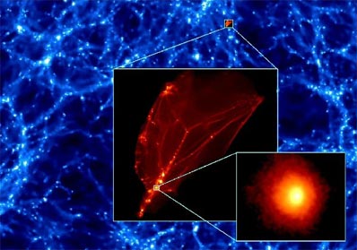 "These dark matter haloes were the gravitational 'glue' that attracted ordinary matter, eventually enabling stars and galaxies to form," said Prof. Ben Moore of the Institute for Theoretical Physics at the University of Zurich, a co-author on the Nature report. "These structures, the building blocks of all we see today, started forming early, only about 20 million years after the big bang." Dark matter comprises over 80 percent of the mass of the universe, yet its nature is unknown. It seems to be intrinsically different from the atoms that make up matter all around us. Dark matter has never been detected directly; its presence is inferred through its gravitational influence on ordinary matter. The Zurich scientists based their calculation on the leading candidate for dark matter, a theoretical particle called a neutralino, thought to have been created in the big bang. Their results entailed several months of number crunching on the zBox, a new supercomputer designed and built at the University of Zurich by Moore and Drs. Joachim Stadel and Juerg Diemand, co-authors on the report. "Until 20 million years after the big bang, the universe was nearly smooth and homogenous", Moore said. But slight imbalances in the matter distribution allowed gravity to create the familiar structure that we see today. Regions of higher mass density attracted more matter, and regions of lower density lost matter. Dark matter creates gravitational wells in space and ordinary matter flows into them. Galaxies and stars started to form as a result about 500 million years after the big bang, whereas the universe is 13.7 billion years old. Using the zBox supercomputer that harnessed the power of 300 Athlon processors, the team calculated how neutralinos created in the big bang would evolve over time. The neutralino has long been a favoured candidate for "cold dark matter," which means it does not move fast and can clump together to create a gravitational well. The neutralino has not yet been detected. This is a proposed "supersymmetric" particle, part of a theory that attempts to rectify inconsistencies in the standard model of elementary particles. For the past two decades scientists have believed that neutralinos could form massive dark matter haloes and envelope entire galaxies today. What has emerged from the Zurich team's zBox supercomputer calculation are three new and salient facts: Earth-mass haloes formed first; these structures have extremely dense cores enabling quadrillions to have survived the ages in our galaxy; also these "miniature" dark matter haloes move through their host galaxies and interact with ordinary matter as they pass by. It is even possible that these haloes could perturb the Oort cometary cloud far beyond Pluto and send debris through our solar system. "Detection of these neutralino haloes is difficult but possible", the team said. The halos are constantly emitting gamma rays, the highest-energy form of light, which are produced when neutralinos collide and self-annihilate. "A passing halo in our lifetime (should we be so lucky), would be close enough for us to easily see a bright trail of gamma rays," said Diemand, now at the University of California at Santa Cruz. The best chance to detect neutralinos, however, is in galactic centres, where the density of dark matter is the highest, or in the centres of these migrating Earth-mass neutralino haloes. Denser regions will provide a greater chance of neutralino collisions and thus more gamma rays. "This would still be difficult to detect, like trying to see the light of a single candle placed on Pluto," said Diemand. NASA's GLAST mission, planned for launch in 2007, will be capable of detecting these signals if they exist. Ground-based gamma-ray observatories such as VERITAS or MAGIC might also be able to detect gamma rays from neutralino interactions. In the next few years the Large Hadron Collider at CERN in Switzerland will confirm or rule out the concepts of supersymmetry. Albert Einstein and Erwin Schroedinger were amongst the previous professors working at the Institute for Theoretical Physics at the University of Zurich, who made substantial contributions to our understanding of the origin of the universe and quantum mechanics. The year 2005 is the centenary of Einstein's most remarkable work in quantum physics and relativity. In 1905 Einstein earned his doctorate from the University of Zurich and published three science-changing papers. Note to editors: The innovative supercomputer designed by Joachim Stadel and Ben Moore is a cube of 300 Athlon processors interconnected by a two-dimensional high-speed network from Dolphin/SCI and cooled by a patented airflow system. Stadel, who led the project, noted: "It was a daunting task assembling a world-class supercomputer from thousands of components, but when it was completed it was the fastest in Switzerland and the world's highest density supercomputer. The parallel simulation code we use splits up the calculation by distributing separate parts of the model universe to different processors." |