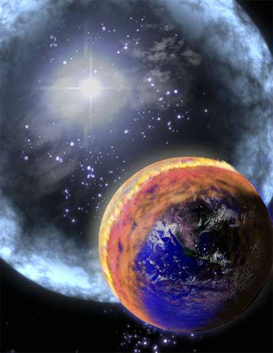 In this artist's conception we see the gamma rays hitting the Earth's atmosphere. The gamma rays would destroy the ozone layer, breaking apart and ultimately converting ozone molecules into brown, smog-like nitrogen dioxide. Credit: NASA