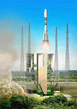 Officials have been working on joint Russian and European programs more frequently over the past decade, and several governmental treaties and industry agreements over the past few years have been leading up to the final contract signing that came Monday. The $446 million project will require infrastructure provided by Russian contractors tailored for the Soyuz rocket, which is manufactured by TsSKB Progress located in Samara. Rockets to be flown from Kourou will be fitted with a Fregat upper stage built by NPO Lavochkin, while an industry team led by the KBOM design office will be responsible for ground systems. The cost will be split between $289 million in direct funding from the European Space Agency, while $157 million will be in the form of a loan to Arianespace from the European Investment Bank. Activities outlined by the contract include the construction of the launch pad components and their assembly, system testing, required modifications of the Soyuz to work using the Guiana Space Center's tracking and support equipment, and final development of the upgraded Soyuz 2-1b vehicle scheduled to debut next year with a French science satellite payload. The Soyuz 2-1b features an upgraded third stage engine that enhances performance. A transitional vehicle called the Soyuz 2-1a tested a new digital control system last November that can deliver spacecraft into more precise orbits and allows for an enlarged four-meter payload fairing to carry larger satellites. With technical upgrades and the ability to take advantage of the Earth's rotation at an equatorial launch site, the Soyuz can double its carrying capacity above its current capability from the Baikonur Cosmodrome in Kazakhstan. Launches from Baikonur are currently marketed by Starsem, a joint company owned by Arianespace and other European and Russian industry leaders. The Soyuz will use a brand new launch complex located about 10 kilometers north of the operational ELA-3 launch pad that hosts the heavy-lift Ariane 5 booster. The ELA-1 facility -- used to launch the earliest Ariane rockets over two decades ago -- is now being transformed for launches by the small-satellite Vega launcher currently under development. The new Soyuz facility in Kourou will consist of a forward zone containing the launch pad and a rear zone where rockets will be assembled and payloads can be attached. The vehicle will be transferred horizontally on 700-meter rail tracks to be erected on the launch pad for final preparations. Construction of the launch complex should get underway soon, and it is expected to be complete in less than two years in advance of the first blastoff in the next chapter of the Soyuz program's storied history some time at the end of 2007 or in early 2008. When all three launch systems are in place beginning in 2008, Arianespace will offer rockets covering virtually the entire space launch market. The Ariane 5 rocket currently competes for heavy-lift commercial and European civil missions, and can deliver between six and 10 metric tons to geostationary transfer orbit. Soyuz rockets will capture the mid-level market consisting of payloads to a similar orbit, while the solid-fueled Vega will truck smaller satellites to low orbits. Le Gall reported that Arianespace has already penned customers for the first Soyuz launch from Kourou in 2008. It is believed the flight will carry a pair of French research satellites and an Australian Optus communications satellite. |