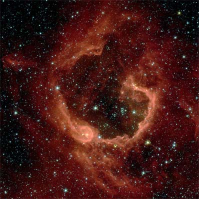 NASA's Spitzer Space Telescope easily detects infrared light from the dust particles in RCW 79. The young stars within RCW 79 radiate ultraviolet light that excites molecules of dust within the bubble. This causes the dust grains to emit infrared light that is detected by Spitzer and seen here as the extended red features.