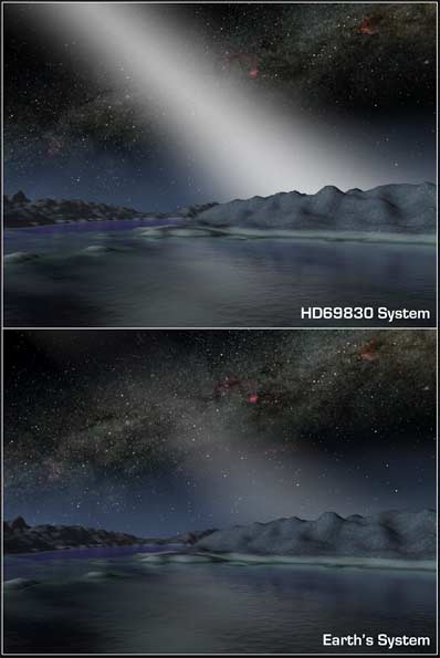 Asteroid belts are the junkyards of planetary systems. They are littered with the rocky scraps of failed planets, which occasionally crash into each other, kicking up plumes of dust. In our own solar system, asteroids have collided with Earth, the moon and other planets. If confirmed, the new asteroid belt would be the first detected around a star about the same age and size as our Sun. The star, called HD69830, is located 41 light-years away from Earth. There are two other known distant asteroid belts, but they circle younger, more massive stars. While this new belt is the closest known match to our own, it is not a perfect twin. It is thicker than our asteroid belt, with 25 times as much material. If our solar system had a belt this dense, its dust would light up the night skies as a brilliant band. The alien belt is also much closer to its star. Our asteroid belt lies between the orbits of Mars and Jupiter, whereas this one is located inside an orbit equivalent to that of Venus. Yet, the two belts may have one important trait in common. In our solar system, Jupiter acts as an outer wall to the asteroid belt, shepherding its debris into a series of bands. Similarly, an unseen planet the size of Saturn or smaller may be marshalling this star's rubble.