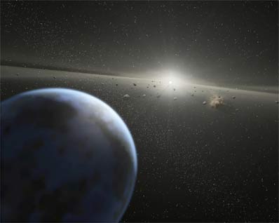 Spitzer telescope sees signs of alien asteroid belt NASA NEWS RELEASE Posted: April 21, 2005 NASA's Spitzer Space Telescope has spotted what may be the dusty spray of asteroids banging together in a belt that orbits a star like our Sun. The discovery offers astronomers a rare glimpse at a distant star system that resembles our home, and may represent a significant step toward learning if and where other Earths form.