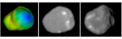 LEFT: Image shows the escape velocities color-coded on a shape model of Amalthea with the same viewpoint as the Voyager spacecraft image in the middle panel. Blue represents the lowest escape velocity, barely 1 meter per second (about 3 feet) near the anti-Jupiter end, while red (barely visible) shows the region of much higher escape velocity, nearly 90 meters per second (295 feet). MIDDLE: This image is a composite from both Galileo and Voyager spacecraft and shows Amalthea from the anti-Jupiter side. RIGHT: A Galileo image of Amalthea. Credit: NASA/JPL/Cornell University