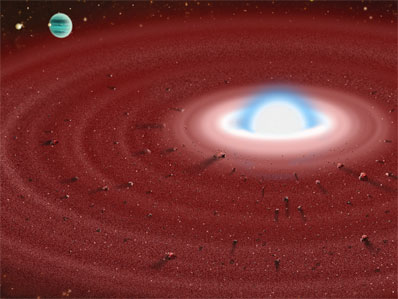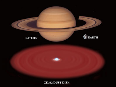 "This is not an easy one to explain," said Eric Becklin, UCLA astronomer and Principal Investigator for the Gemini observations. "Our best guess is that something similar to an asteroid or possibly even a planet around this long-dead star is being ground up and pulverized to feed the star with dust. The parallel to our own solar system's eventual demise is chilling." The Gemini research team includes scientists from UCLA, Carnegie Institution and Gemini Observatory. The results are scheduled for publication in an upcoming issue of the Astrophysical Journal. The results will be published concurrently with complementary near-infrared observations by a University of Texas (UT) team led by Mukremin Kilic made at the NASA Infrared Telescope Facility (IRTF) also on Mauna Kea. "We now have a window to the future of our own planetary system," said Benjamin Zuckerman, UCLA professor of physics and astronomy, member of NASA's Astrobiology Institute, and a co-author on the Gemini- based paper. "For perhaps the first time, we have a glimpse into how planetary systems like our own might behave billions of years from now." "The reason why this is so interesting is that this particular white dwarf has by far the most metals in its atmosphere of any known white dwarf," Zuckerman added. "This white dwarf is as rich in calcium, magnesium and iron as our own sun, and you would expect none of these heavier elements. This is a complete surprise. While we have made a substantial advance, significant mysteries remain." "We have confirmed beyond any doubt that dust never does sleep!" quips Gemini Observatory's Inseok Song, a co-author on the paper. "This dust should only exist for hundreds of years before it is swept into the star by gravity and vaporized by high temperatures in the star's atmosphere. Something is keeping this star well stocked with dust for us to detect it this long after the star's death." "There are just precious few scenarios that can explain so much dust around an ancient star like this," said UCLA's Mike Jura who led the effort to model the dust environment around the star. "We estimate that GD 362 has been cooling now for as long as five billion years since the star's death-throes began and in that time any dust should have been entirely eliminated." Jura likens the disk to the familiar rings of Saturn and thinks that the dust around GD 362 could be the consequence of the relatively recent gravitational destruction of a large "parent body" that got too close to the dead star. GD 362 is a white dwarf star. It represents the end-state of stellar evolution for stars like the Sun and more massive stars like this one's progenitor, which had an original mass about seven times the Sun's. After undergoing nuclear reactions for millions of years, GD 362's core ran out of fuel and could no longer create enough heat to counterbalance the inward push of gravity. After a short period of instability and mass loss, the star collapsed into a white-hot corpse. The remains are cooling slowly over many billions of years as the dying ember makes its slow journey into oblivion.