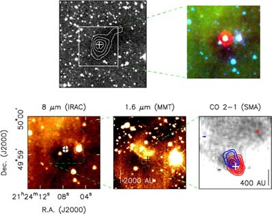 "This object is the runt of the star formation family," said CfA astronomer Tyler Bourke. Establishing the true nature of the object required the unique capabilities of the Submillimeter Array (SMA) in Hawaii. "The SMA spotted what no single-dish telescope could see," said Bourke. Using the SMA, scientists detected a weak outflow of material predicted by star formation theories. That outflow - 10 times smaller in mass than any seen before - confirmed both the low-mass nature of the object and its association with the surrounding dark cloud. "The sensitivity and resolution of the Submillimeter Array with its multiple antennas were crucial in detecting the outflow," said Bourke. The puzzling object was discovered using a Smithsonian-developed infrared camera on board NASA's Spitzer Space Telescope. Spitzer studied the dusty cosmic cloud named L1014 as part of the Cores to Disks Legacy program. A core is the densest region of a cloud, massive enough to make a star like the sun. L1014, located about 600 light-years away in the constellation Cygnus the Swan, initially was classified as a "starless core" because it showed no evidence for star formation. Astronomers were surprised when Spitzer images revealed a faint infrared light source that appeared to be within the core. Additional data were needed to confirm that the faint object was directly associated with the dark core, rather than being a chance superposition of a more distant, more mundane background object. Near-infrared observations by the MMT Observatory in Arizona revealed a scattered light nebula surrounding the faint central object in L1014. "Light from the object is bouncing off surrounding dust and toward us," said CfA astronomer Tracy Huard, who took the MMT images. "Reflection nebulosity like that is a fingerprint of an embedded object." The apparent size of the nebulosity indicated that the light source likely was located within L1014 and not in a more distant cloud. MMT data also gave investigators the orientation in space, or tilt, of the object within L1014. Astronomers then turned to the SMA for final confirmation. "The Spitzer observations gave us hints to the nature of the object inside L1014. The MMT strengthened the association between the infrared source and the starless core. The Submillimeter Array clinched the case and revealed this object's true identity," said Bourke. By studying faint, young objects like the one still forming within L1014, astronomers hope to learn more about the early stages of star formation. "The most elusive part of star formation is the moment of birth," said CfA astronomer Phil Myers. "In order to answer how it happens, you need examples of very young systems. This system is only about 10,000 to 100,000 years old-a baby as far as stars or brown dwarfs go." The combined capabilities of Spitzer, the SMA and the MMT were essential for finding and examining this object. Those facilities undoubtedly will prove useful in studying similar very dim, very young objects - objects so young that they are still growing. "They're so young and faint that we can't tell how much mass they will accumulate," Myers added. "There's no prenatal test for these objects. We're not sure exactly what we'll get in the end!" Headquartered in Cambridge, Mass., the Harvard-Smithsonian Center for Astrophysics (CfA) is a joint collaboration between the Smithsonian Astrophysical Observatory and the Harvard College Observatory. CfA scientists, organized into six research divisions, study the origin, evolution and ultimate fate of the universe. |