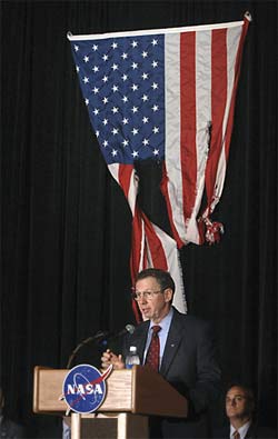 NASA Adminstrator Michael Griffin speaks beneath the tattered flag that flew over Michoud Assembly Facility during Hurricane Katrina last year. Credit: NASA/MSFC David Higginbotham