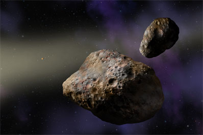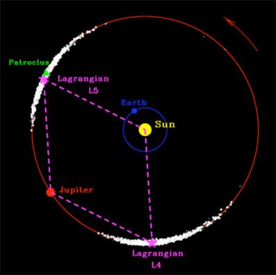 Trojan asteroids are those that lie 60 degrees in front or 60 degrees behind the planet Jupiter in its orbit around the Sun. They are relatively small and quite faint, making them difficult to study even with the world's largest ground-based telescopes. A new technique using sodium lasers with ground-based image-correcting technology called "Laser Guide Star Adaptive Optics" (LGS-AO) is helping scientists study asteroids with more detail than ever before. The LGS-AO system installed on the Keck II 10-meter telescope at Mauna Kea removes the blurring effects caused by Earth's atmosphere from astronomical images and produces the finest infrared images in the world. "Space telescopes are tremendous tools for observing remote solar system targets, but large ground-based telescopes equipped with Laser Guide Star Adaptive Optics systems provide both the power to collect more light and the ability to study objects with even more detail," said Dr. David Le Mignant, adaptive optics scientist and lead team member for the LGS-AO science operations at the W. M. Keck Observatory. "With LGS-AO, we observe a different population of solar system targets: fainter and smaller objects like Patroclus and more distant ones like the object beyond Pluto. This should lead us to many new discoveries," added Dr. Le Mignant. Modern theories suggest that Trojan asteroids may have formed in the Solar Nebula at the same time as the rest of the solid bodies in the Solar System. To date, more than one thousand such asteroids have been discovered. Asteroid Patroclus was previously believed to be a single object about 150 kilometers (90 miles) in diameter, but recent observations from the Gemini North telescope in Hawaii found that Patroclus is actually comprised of two objects, making it the first binary Trojan asteroid to be discovered. The discovery of a binary asteroid was not as surprising as the fact that the two objects are nearly identical in size. Dr. Marchis' team found the larger piece is 122 kilometers (76 miles) wide at its largest point, and the similar-sized partner is 112 kilometers (70 miles). The two pieces orbit their center of mass every four days, separated by a distance of about 680 kilometers (423 miles). The names of these objects are associated with the heroes of Homer's Iliad. The asteroid Patroclus was named after the best friend and companion to Achilles, the main character of the story and Greek hero of the Trojan War. Scientists believe there may be as many Trojan asteroids as there are main-belt asteroids, but they are difficult to study with high spatial resolution because they are too faint for most adaptive optics systems. "The Laser Guide Star system is a remarkable breakthrough in ground-based observations," said Dr. Franck Marchis of the University of California at Berkeley. "With such a capability we are able to regularly study small bodies in the solar system in ways that were not possible before. We want to thank the Keck Observatory Adaptive Optics team for their involvement in our observing program which helped make these results possible." Since collisions of small bodies in the solar system typically happen at relatively high speeds and leave behind lots of small debris, it is unlikely that Patroclus was formed this way, or that an asteroid the size of Patroclus would have experienced a collision in the last billion years. How then, could the Patroclus binary system have formed?