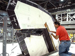"While they were doing that, they dropped some equipment off the tray," said Jessica Rye, a NASA spokeswoman. "What they dropped was a film processor, it struck the left hand side of the body flap. There was some tile damage on the body flap, which they're addressing. They're looking, of course, at structural inspections to evaluate if there is any structural damage to the body flap." In Discovery's hangar (OPF Bay 3), meanwhile, engineers are continuing inspections of the shuttle's 50-foot-long robot. Friday night, engineers servicing the shuttle's heat shield tiles broke a light fixture. During work to vacuum up the fragments, a telescoping bucket used to move technicians from point to point in the cargo bay bumped into the robot arm. Insulation blankets were removed and engineers spotted apparent damage to an aluminum grounding strap that runs the length of the arm. In addition, there are two small indentations in the arm's so-called outer bumper, an epoxy honeycomb material that protects the arm's underlying carbon composite structure. One indentation is .115 inches deep and 1 inch long and the other is .035 inches deep and a half-inch long. During Discovery's upcoming mission, the shuttle arm will be used to pick up a long boom equipped with cameras and laser sensors to inspect the shuttle's heat-shield system after launch. In addition, two astronauts will ride about on the end of the boom during the first of three planned spacewalks as part of an engineering study to evaluate the extended arm-boom system's stability. The idea is to find out if the system could be used for heat-shield repair work if such work is ever needed. To help evaluate the loads on the arm-boom system, Discovery's robot arm has been instrumented and engineers want to make sure the arm itself and the instrumentation were not damaged by the work bucket incident. As of this writing, the arm damage does not appear to be a threat to the shuttle schedule, but engineers won't know for sure until the ultrasound tests are complete. |