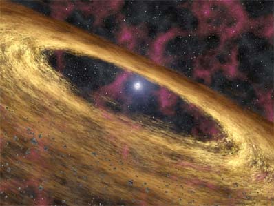 The infrared telescope surveyed the scene around a pulsar, the remnant of an exploded star, and found a surrounding disk made up of debris shot out during the star's death throes. The dusty rubble in this disk might ultimately stick together to form planets. This is the first time scientists have detected planet-building materials around a star that died in a fiery blast. "We're amazed that the planet-formation process seems to be so universal," said Dr. Deepto Chakrabarty of the Massachusetts Institute of Technology in Cambridge, principal investigator of the new research. "Pulsars emit a tremendous amount of high energy radiation, yet within this harsh environment we have a disk that looks a lot like those around young stars where planets are formed." A paper on the Spitzer finding appears in the April 6 issue of Nature. Other authors of the paper are lead author Zhongxiang Wang and co-author David Kaplan, both of the Massachusetts Institute of Technology. The finding also represents the missing piece in a puzzle that arose in 1992, when Dr. Aleksander Wolszczan of Pennsylvania State University found three planets circling a pulsar called PSR B1257+12. Those pulsar planets, two the size of Earth, were the first planets of any type ever discovered outside our solar system. Astronomers have since found indirect evidence the pulsar planets were born out of a dusty debris disk, but nobody had directly detected this kind of disk until now. The pulsar observed by Spitzer, named 4U 0142+61, is 13,000 light-years away in the Cassiopeia constellation. It was once a large, bright star with a mass between 10 and 20 times that of our sun. The star probably survived for about 10 million years, until it collapsed under its own weight about 100,000 years ago and blasted apart in a supernova explosion. Some of the debris, or "fallback," from that explosion eventually settled into a disk orbiting the shrunken remains of the star, or pulsar. Spitzer was able to spot the warm glow of the dusty disk with its heat-seeking infrared eyes. The disk orbits at a distance of about 1 million miles and probably contains about 10 Earth-masses of material. Pulsars are a class of supernova remnants, called neutron stars, which are incredibly dense. They have masses about 1.4 times that of the sun squeezed into bodies only 10 miles wide. One teaspoon of a neutron star would weigh about 2 billion tons. Pulsar 4U 0142+61 is an X-ray pulsar, meaning that it spins and pulses with X-ray radiation. Any planets around the stars that gave rise to pulsars would have been incinerated when the stars blew up. The pulsar disk discovered by Spitzer might represent the first step in the formation of a new, more exotic type of planetary system, similar to the one found by Wolszczan in 1992. "I find it very exciting to see direct evidence that the debris around a pulsar is capable of forming itself into a disk. This might be the beginning of a second generation of planets," Wolszczan said. Pulsar planets would be bathed in intense radiation and would be quite different from those in our solar system. "These planets must be among the least hospitable places in the galaxy for the formation of life," said Dr. Charles Beichman, an astronomer at NASA's Jet Propulsion Laboratory and the California Institute of Technology, both in Pasadena, Calif. The Jet Propulsion Laboratory manages the Spitzer Space Telescope mission for NASA's Science Mission Directorate, Washington. Science operations are conducted at the Spitzer Science Center at Caltech. JPL is a division of Caltech. Spitzer's infrared array camera, which made the pulsar observations, was built by NASA's Goddard Space Flight Center, Greenbelt, Md. The instrument's principal investigator is Dr. Giovanni Fazio of the Harvard-Smithsonian Center for Astrophysics. |