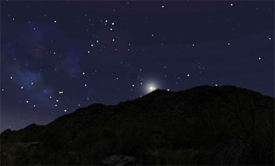 Simulated night sky looking south from the location of the petroglyph at midnight on May 1, 1006. The horizon profile is a true representation of the site horizon, made from photographs taken at the site and placed correctly with respect to the stars and the direction of true south. The supernova appears just above the horizon near center; the constellation Scorpius grzes the horizon left of center. Credit: Gilbert A. Esquerdo (Planetary Science Institute, Tucson, and Smithsonian Astrophysical Observatory) Download larger image version here