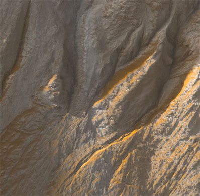 "You see more-ice-rich and less-ice-rich layers, which tells you that conditions changed from the time one layer was deposited to the time another layer was deposited," said Dr. Scott Murchie of Johns Hopkins University Applied Physics Laboratory, Laurel, Md. Murchie is the principal investigator for the spectrometer on the spacecraft. "These layers are geologically young -- on the order of thousands or millions of years -- and may hold clues about climate cycles." A lower-latitude target was Mawrth Vallis. The European Mars Express spacecraft previously discovered ancient deposits of clay minerals that could form only if water were present for a long time at Mawrth Vallis. The Mars Reconnaissance Orbiter's spectrometer has resolved smaller-scale compositional features and detected differing clay mineral content. The clay-rich areas show some of the best evidence for conditions possibly favorable for life on ancient Mars, Murchie said. The mission's High Resolution Imaging Science Experiment camera has shown unprecedented detail in orbital images of Mars. An example was released recently showing the Opportunity rover at Victoria Crater. The camera imaged 64 areas on Mars during the testing week. "These images are truly beautiful, and since they resolve features the size of people, you can visualize yourself hiking around in these diverse terrains," said the camera's principal investigator, Dr. Alfred McEwen of the University of Arizona, Tucson. The high-resolution camera, the imaging spectrometer and the orbiter's wider-looking Context Camera all observed Mawrth Vallis. Details visible in the new observations, such as small channels, are consistent with past wet conditions, McEwen said. Another observation of an unnamed southern crater shows relatively young gullies, like those seen in many Mars locations viewed by NASA's Mars Global Surveyor orbiter. Braided channels characteristic of sediment-rich streams are visible in the new observations. This reinforces the interpretation that these geologically young gullies formed at least in part from erosion by flowing water. Original discovery of the many geologically young gullies on Martian slopes was by Dr. Michael Malin of Malin Space Science Systems, San Diego. The Mars Reconnaissance Orbiter is managed by the Jet Propulsion Laboratory, Pasadena, Calif., for NASA's Science Mission Directorate, Washington. All of today's images are available here. |